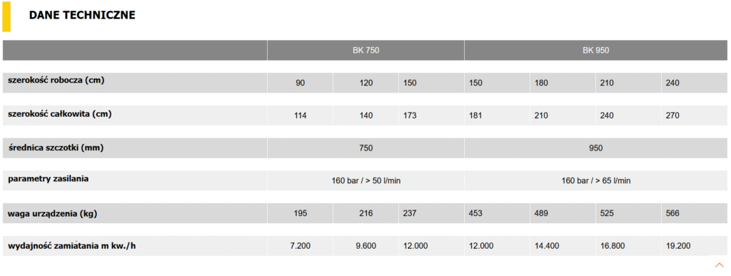 - Średnica szczotki 750 mm lub 950 mm w zależności od szerokości roboczej
